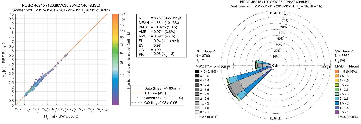 An example of a comparison between a MIKE MS model run using 100 events and a model run simulating all timesteps and using an instationary formulation is shown in the figure below, for a location off the US west coast.