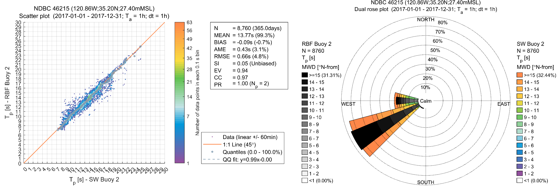 Comparison of a MIKE MS run using 100 events against a detailed model run simulating all timesteps and using an instationary formulation. Comparison plots show significant wave height [m] (top) and peak wave period [s] (bottom) for a location off US west coast. Note this is a model to model comparison.