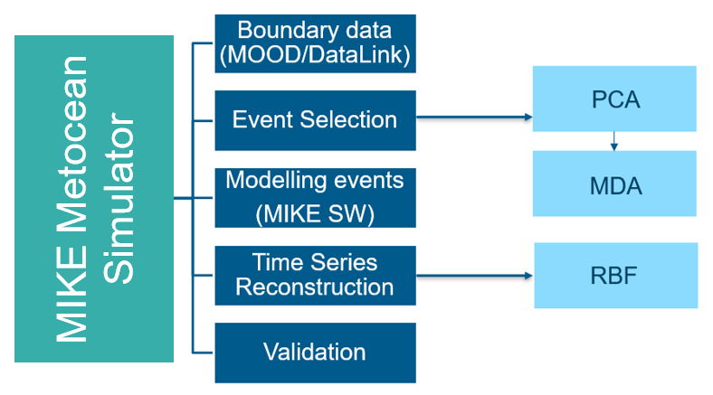 MIKE MS follows the scientific basis defined by Camus et al (2013)(1), and is implemented by DHI as shown in the figure below. The diagram shows the sequence of obtaining boundary conditions and selecting a subset of the events by using principal component analysis (PCA) and maximum dissimilarity analysis (MDA). At completion of the modelling of the selected events the full timeseries is reconstructed using a radial basis function (RBF).