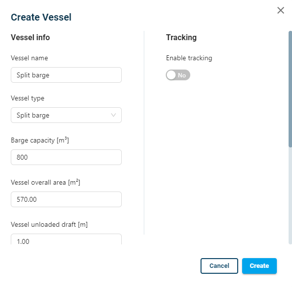 Give a name to the vessel, then choose the vessel type from the drop-down list. The default types of vessels available are: