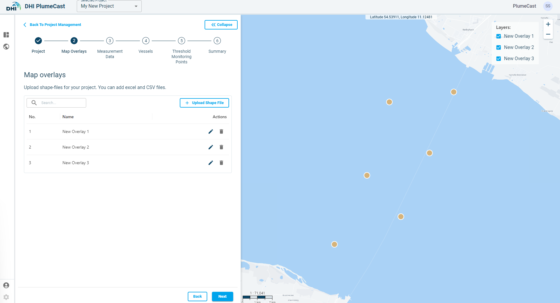 After a successful upload, your shapefile appears in the list of map overlays, where you can edit or delete it. The project map overlays can be visualised on the map on right panel.