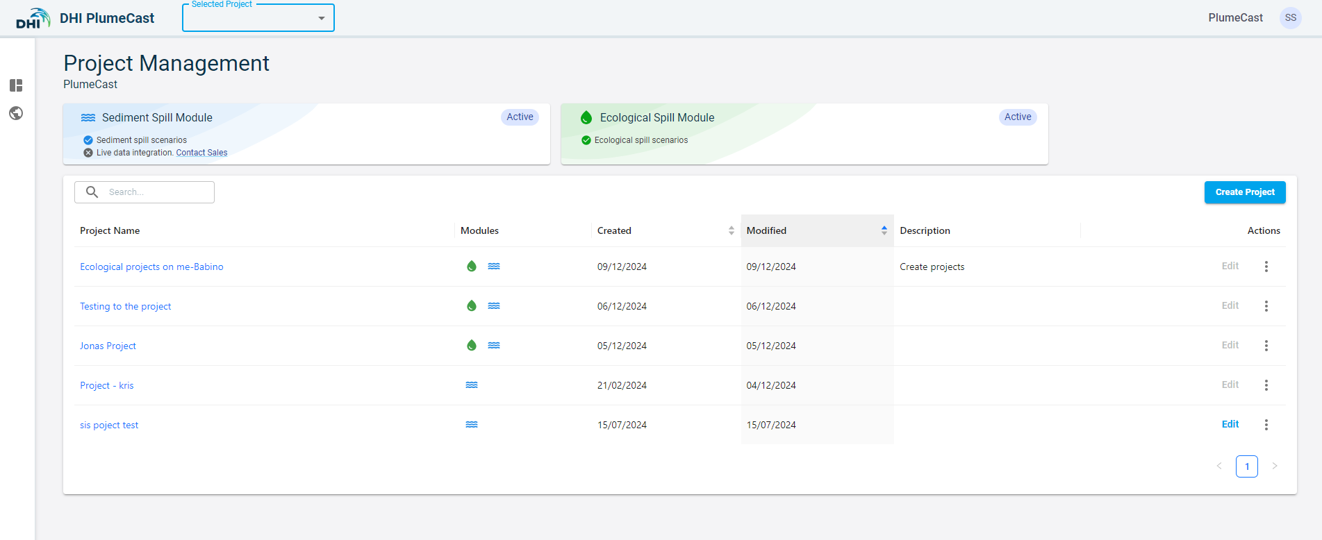 First step in using DHI PlumeCast is to create a Project. When you login for the first time, and have no project defined, you will be directed to the ‘Project Manager’ page in which you can create your first project.