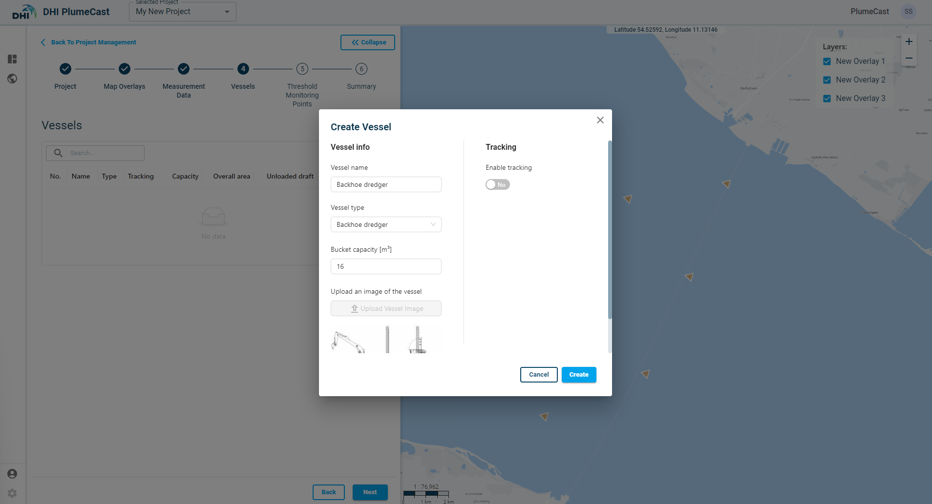 In this step you can add different types of vessels required in the project. The added vessels can then be used for Dredging and Disposal in scenarios, or for live tracking in the Monitoring map when using DHI PlumeCast with access to Live Data.