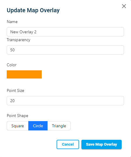 If the map-overlay is a point, you can change the size of the point, and the shape of the point to be shown as a circle, triangle, or a square on the map: