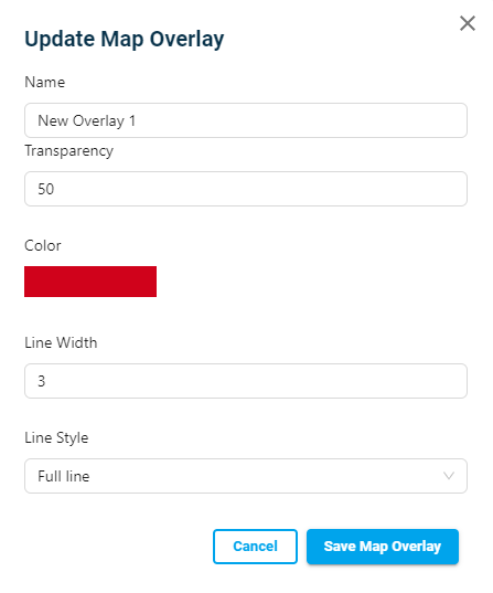 If the map-overlay is a line, you can change the line thickness, and the line style to be continues (full line) or dashed line.